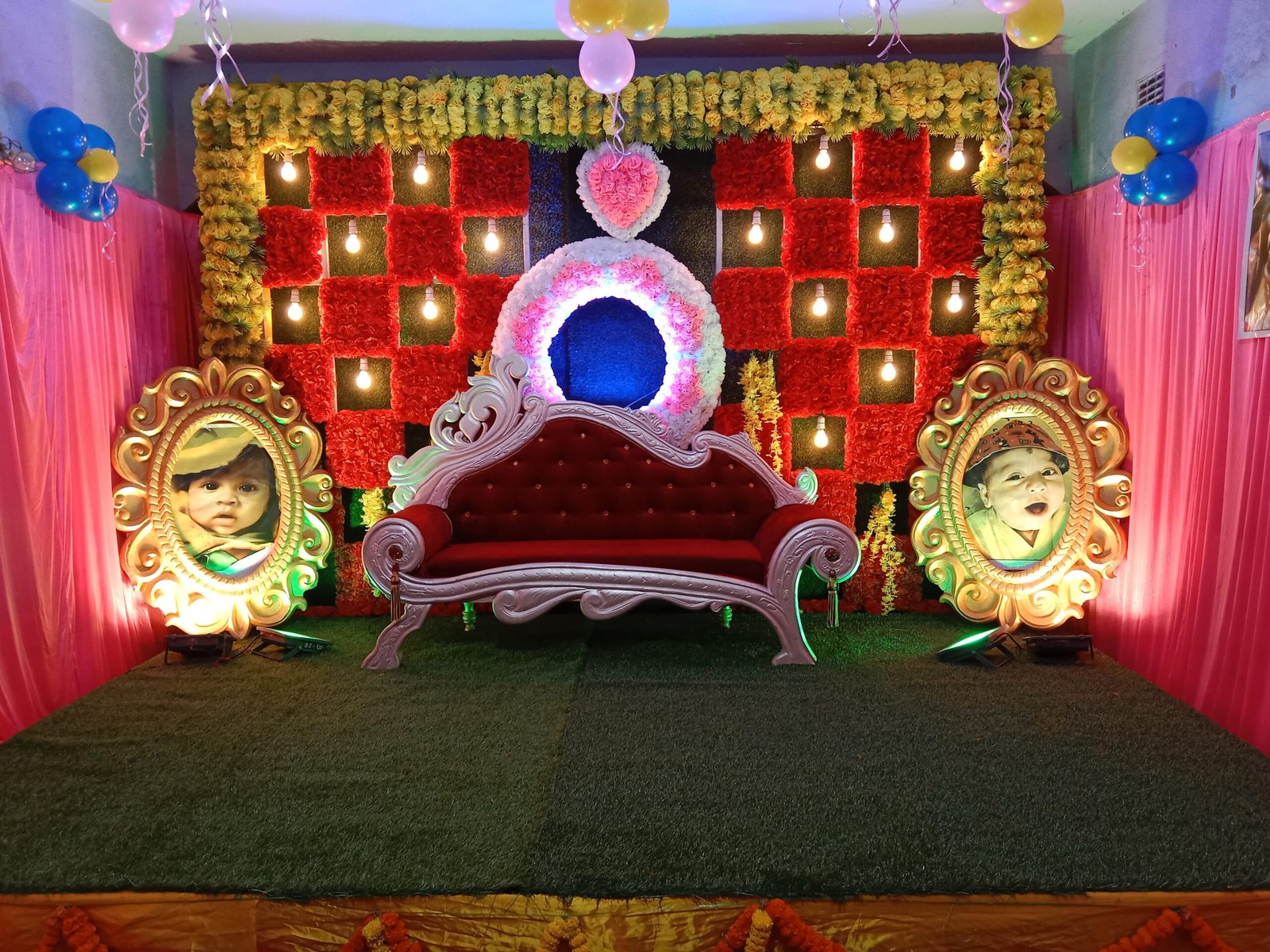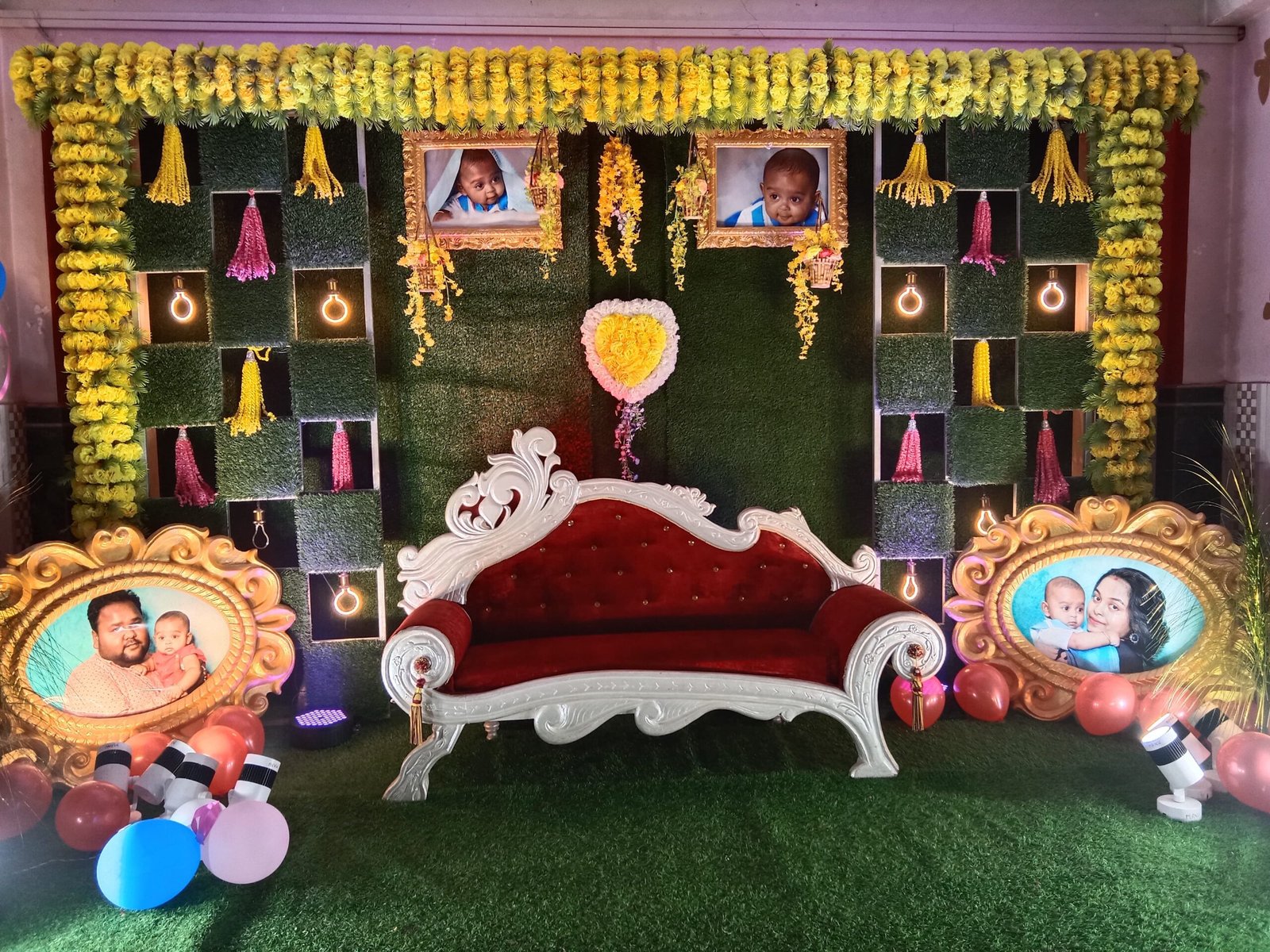 We organize newborn welcome ceremonies, baby naming ceremonies, cradle ceremonies, first birthdays, kids’ birthdays, and elegant family birthday celebrations with customized décor.